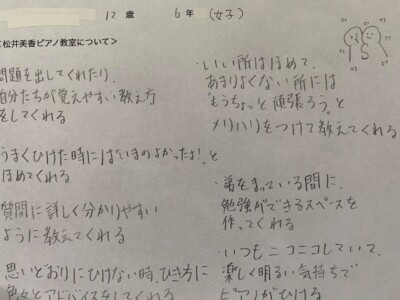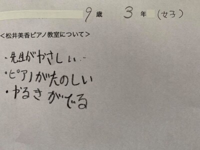 私自身が子どもの頃に通っていたピアノ教室の先生が苦手で楽しめずやめてしまったのですが、松井先生はとても明るく楽しめるようにレッスンをしてくださるので娘も楽しく通っています。