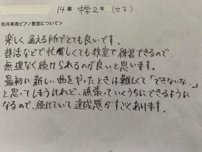 毎週、先生といろんな話をして、元気をもらっています。進路相談などでも親身になって聞いてもらえるところが好きです。また、自分のペースに合わせてレッスンしてもらえるところが素晴らしいです。