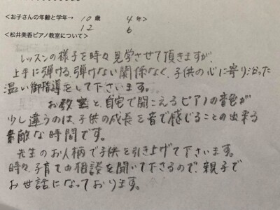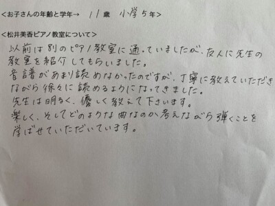 ピアノの技術というだけでなく、音楽自体の楽しさを教えていただいてます。以前は教師であり、現在は母であり音楽家でもある先生に、いろいろな面から子どもも親もサポートしていただいてます。先生との関係が良いので、子どもも難しいことにチャレンジする気持ちになります。